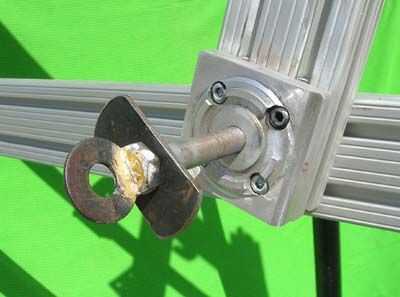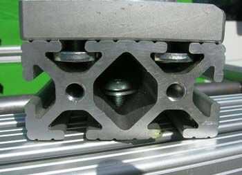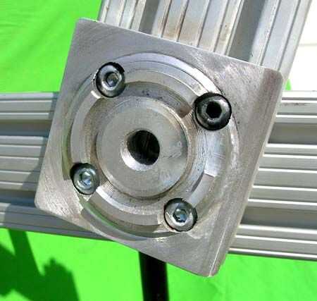 El haz gira alrededor de un perno de cabeza allen de M8 que se encuentra dentro de la cavidad central de la viga 8020, como se muestra en la cuarta foto. Esto da espacio para el perno de sujeción del post BB a hilo en la placa base. Parece gracioso, con tan poco contacto, por lo que si tienes un molino de extremo al menos podría molino un plano pequeño para sentarse en la cabeza del perno. Pero parece que sólo funciona bien sin él. Las roscas de tornillo en una tuerca en T 8020. Puede cargar el perno desde el final de la extrusión por lo que sólo necesitará perforar un agujero a través de la viga, lo suficientemente grande como para permitir que el tornillo pase a través y reunirse con el T-nut. Será lo suficientemente grande para acceder el perno con una llave allen para apretar y aflojar el perno por el agujero central del post de BB.