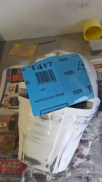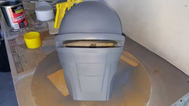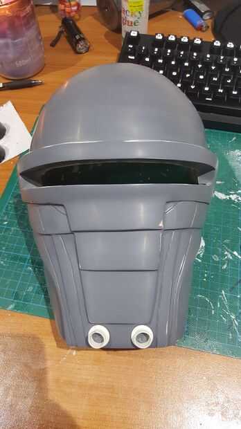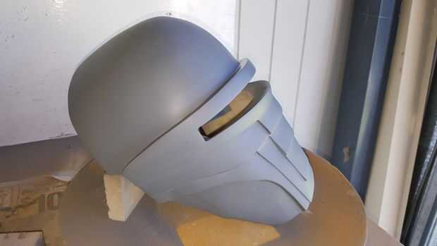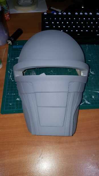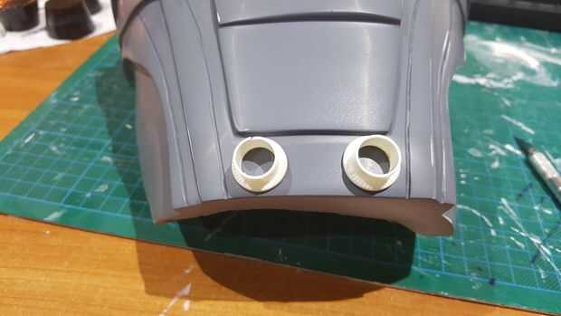 Tuve algunos pregranateados y manchas de mi escultura, usé algunos llenador del cuerpo para arreglar y afilar los bordes de la mascarilla. Tallada también en las líneas a lo largo de la parte delantera de la máscara usando una hoja y cortar los bordes para un mejor molde maestro final y un compró algunos tuerca remache barato inserta para 'altavoces' de la máscara (hecho un molde pequeño, echarlos y pegado en la máscara. Después de lijar la superficie a alrededor de 800grit papel de lija, estaba listo para un molde maestro.