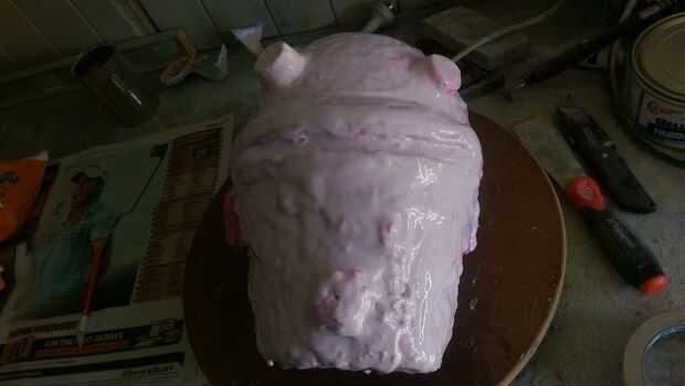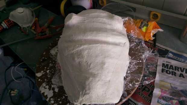La escultura es 'hacer', una vez para hacer un molde. Hizo una pequeña presa para mantener un mínimo escurrimiento y vierte una capa fina de Pinkysil sobre él, asegurándose de evitar burbujas formando y luego vierte una capa gruesa de CloneFX sobre eso. Son ambos moldes de silicona de 2 parte que se mezclan en volúmenes iguales, y se pusieron bastante rápido por lo que son fácil de usar. También hice algunas claves de registro de silicona para mantener el molde en su lugar cuando la máscara. Después de que un vendaje de yeso como una concha de la madre a todo lugar del ion y ya está listo para servir.