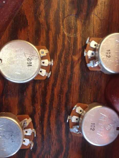 Paso 2 - tierra los 4 potes a sí mismos, ya que esta es la configuración de cableado vintage a tierra el Terminal izquierdo (las protuberancias poco con un agujero en el centro) a los potes de volumen y la terminal del centro en los potes de tono. Lo hice presionando primero la terminal cerca del cuerpo del pote como sea posible y luego sosteniendo la pistola de soldar a la terminal para el calor lo he aplicado de la soldadura hasta que conseguí un buen porro.