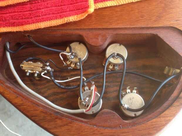 Paso 5 - tengo mi camioneta de cuello con las dos macetas más cercanas al cuerpo y la pastilla del puente soldadas a las dos macetas más cercanas al borde de la guitarra. La pastilla del cuello de la tierra a la olla primero (que va a ser un poco cable sin blindaje) usted puede tierra directamente a la soldadura que está en su bote.