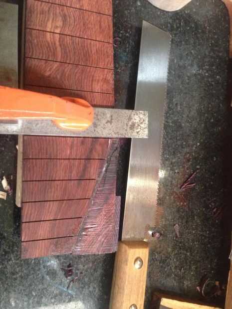 Paso 10 - omitir este paso si usted compró un diapasón ranurado. Si usted no ranurado su diapasón ahora sería un buen momento para hacerlo y no olvides ser preciso al 100% como un diapasón que incorrectamente ha sido ranurado no se entonar correctamente y el instrumento no sonará bien. Para el diapasón de la ranura se puede utilizar una caja de ingletes o una plaza de ingenieros. Lo que hago es primero marcar la posición de los trastes, luego fije mi plaza ingenieros cerca de la línea y utilice mi traste Sierra directamente en la línea para cortar con la mayor precisión posible.