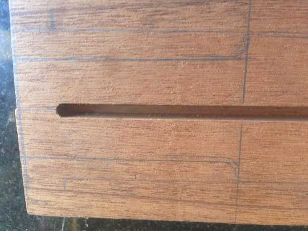 Paso 5 - Si usted recortar su empalme de bufanda con su plaza de ingenieros y un borde plano de la marca del cuello una línea recta perpendicular al plano borde como cerca posible de la rampa de la bufanda. Esta será la ubicación de la tuerca de la guitarra y le permiten visualizar el aplastamiento de la articulación.