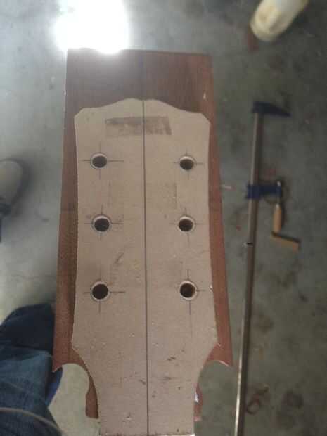 Paso 14 - medir sus afinación cuellos de máquina para perforar el sintonizador en el cabezal. Te recomiendo hacer una plantilla para la forma de su cabeza y taladrar los agujeros de afinación en la plantilla para verificar la exactitud y para asegurarse de que todo se centra. Una vez que estés satisfecho con el diseño del sintonizador y la forma de su cabezal, su plantilla para el cabezal de la abrazadera y rebaje la forma y taladrar los agujeros del sintonizador. También asegúrese de recortar la ranura de la barra del braguero.