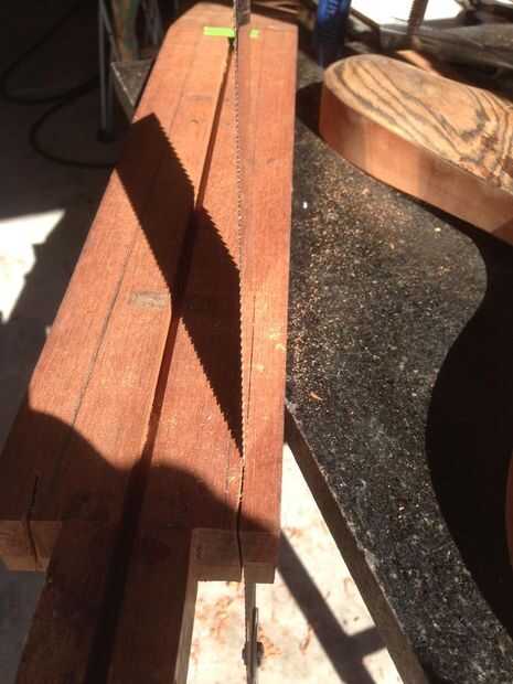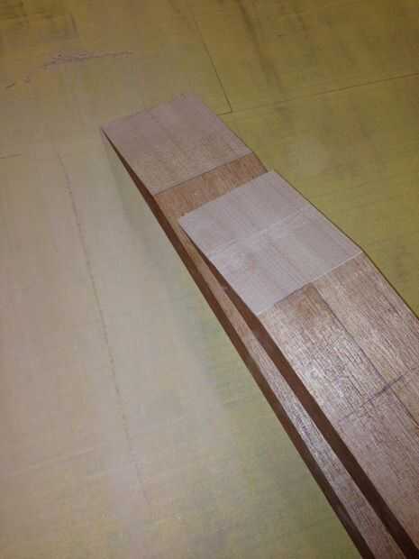 Paso 4 - después el pegamento marca hacia fuera y corte empalme de bufanda para el ángulo adecuado. Personalmente creo que un cuello con una bufanda es más fuerte y menos dispendioso que su hermano de pieza única, pero si decides tener un cuello de una sola pieza, cortar el ángulo para el cabezal, así.