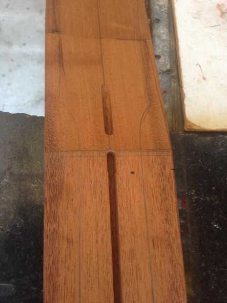 Paso 12 - una vez que el diapasón ha sido correctamente ranurado y el cuello haya secado le tendrá que hacer el tendón del cuello (si es una guitarra del cuello set). Asegúrese de que tiene una línea central establecida en el cuello como este será muy importante mantener todo centrado. Hacer plantillas para la espiga del cuello y mide en 1-1/2 "x 4 1/2" x 1-1/2 "con un ángulo de 3 º a los lados de la espiga para reflejar el grado 3 de la mortaja en el cuerpo.