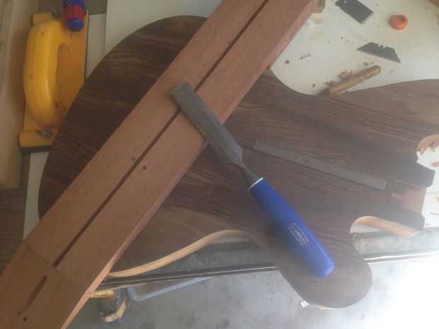 Paso 8 - tiempo para fresar el canal de Truss rod! Medir el espesor, la anchura y la altura de la barra del braguero y marca en el cuello con la línea central para mantener todo centrado. Hay muchas maneras de rebaje el alma, personalmente tengo una plantilla que utilizo con mi router, pero puede utilizar una regla plana para mantener la broca de la fresadora paralela a él o usted puede cortar a mano, utilizando cinceles y herramientas de su marca. Utilice su alma para profundidad y asegúrese de que cabe cómodamente en el canal.