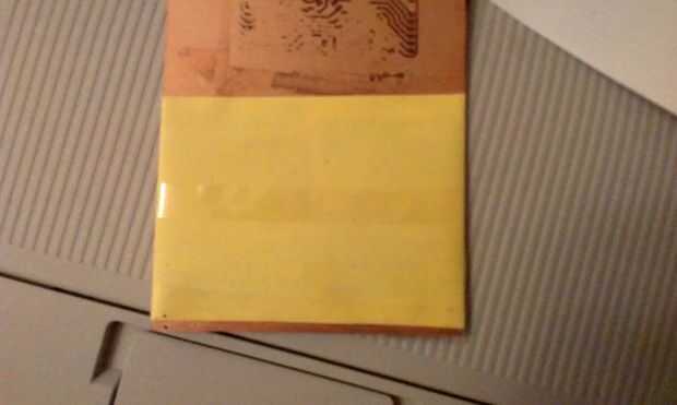 Retire el papel de transferencia de tóner del papel A4, que la parte frontal hacia la placa de cobre, cinta adhesiva. Ahora no importa donde usted la cinta, puede cinta adhesiva directamente sobre el papel de transferencia para asegurarse de que firmemente se traban.