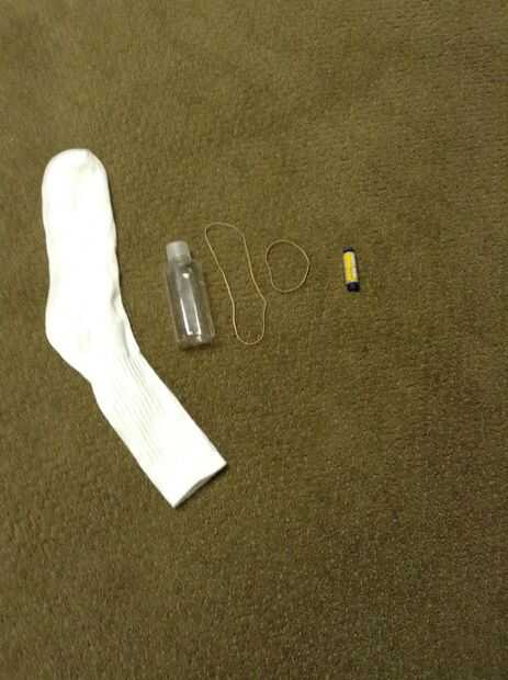 Un calcetín, una botella pequeña, un drenaje agresores y una goma.