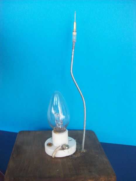 El frasco de cristal tiene que girar en el eje central. Necesitamos un trozo de alambre, un pedazo pequeño de tubo de plástico como un tubo de bolígrafo vacía, una parte más ligera (válvula), una aguja aquellas. Se unen las partes. y coloque una bombilla de luz.