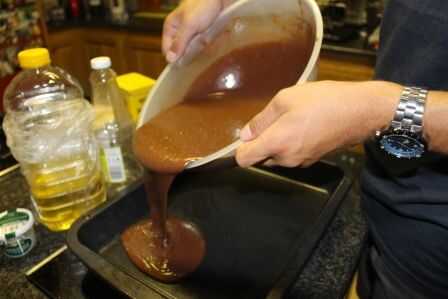 Vierta la mezcla de pastel en la bandeja para hornear y, cuando el horno esté lo suficientemente caliente, colocarla en el horno. Dejar el pastel para 20-30 minutos. Hay muchas maneras de comprobar que si una torta está lista o no, prefiero lo que me enseñó mi mamá.