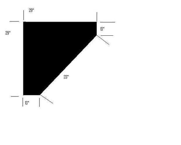 Elegí un diseño de pieza de la esquina como el más sentido dado lo que tenía que trabajar con, y como se puede ver en el patrón a continuación, en lugar de lo que es sólo un triángulo me trajo los lados a 13" que me dé un poco más espacio para trabajar con. También estaba pensando en colocar un estante de 13" a un lado pero después puse la mesa en se dio cuenta que realmente no necesitaba el almacenamiento extra.