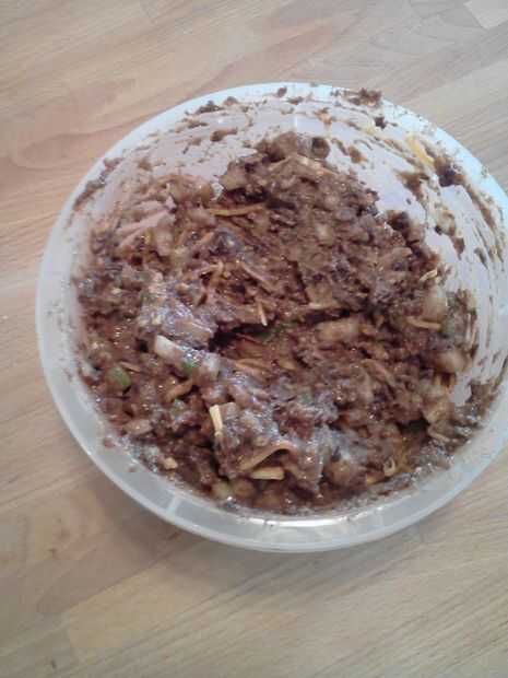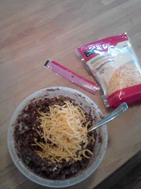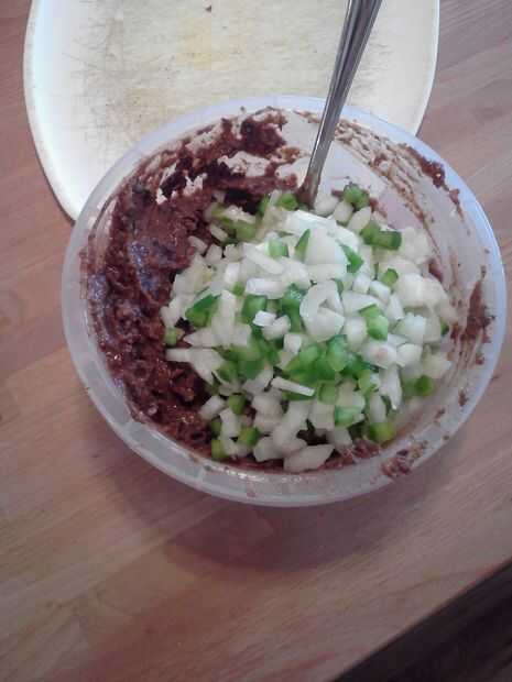 Escurra los frijoles y combinar todo, pero la cebolla y el pimiento en una licuadora. Esto obtiene cerca del 50%. Entonces puse en un tazón pequeño y romper con una cuchara grande con agujeros. La consistencia estará super pegajosa crema. Ahora agregue la cebolla, pimienta y algunas cheese(optional) rallado. mezclar hasta que la textura es consistente. Debe ser tan grueso como el helado suave del servicio. Añadir un poco pan rallado para espesar y añadir un poco de huevo para aflojar si es necesario.