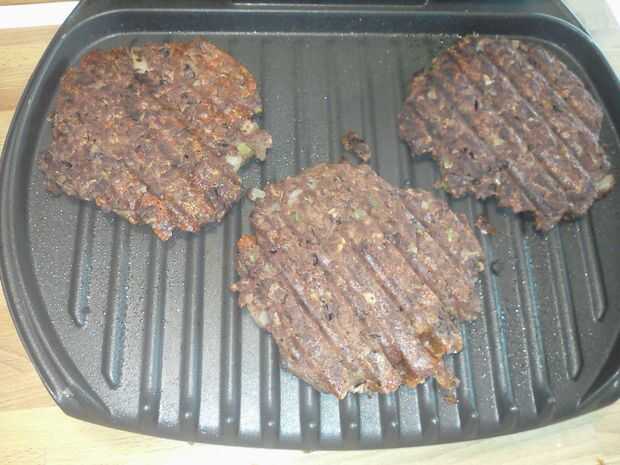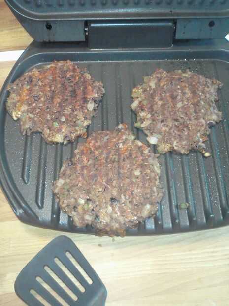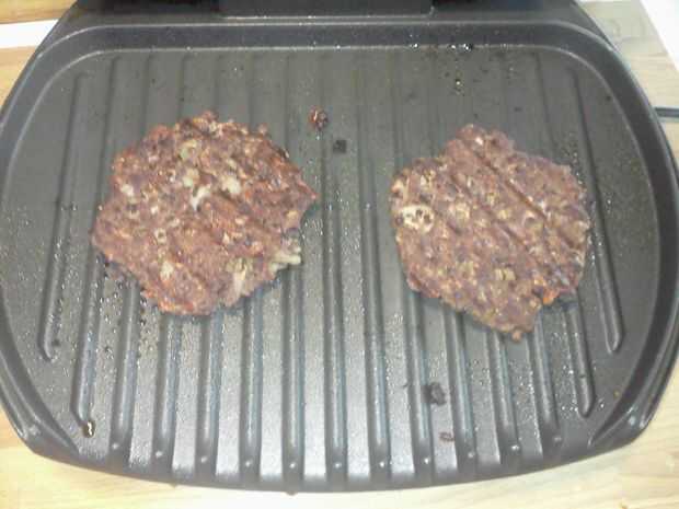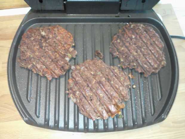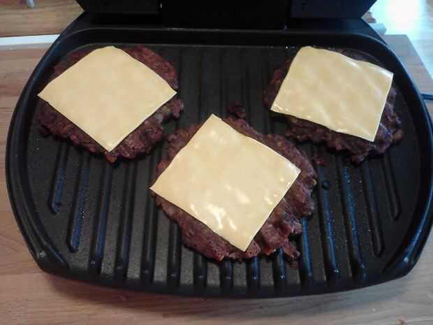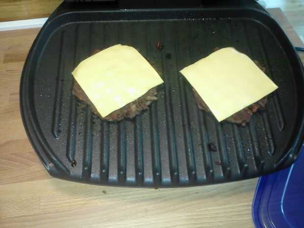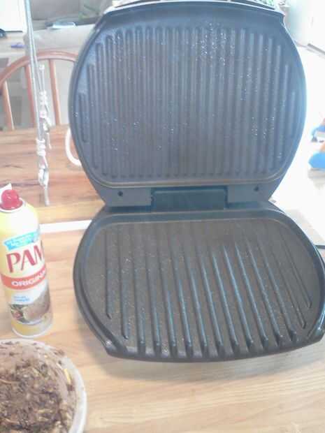 Normalmente tirarlos a la parrilla fuera pero ha estado lloviendo a cántaros todo el dia. Rocíe Pam un poco en la parte superior e inferior del George. No hay necesidad para sacarlos del partido. Acaba de obtener una mano o una cuchara completa y separada en la forma de un partido. hacen el grueso de 3/4". Al cocinar de esta manera, cierre la tapa y cocinar durante 15 minutos Voltear y cocinar durante 5 minutos. Si usted Derretir queso en el suyo deje la tapa abierta durante cinco minutos. Tuvimos una gran conexión, batatas fritas y tots. También tostado el pan mientras la tostadora caliente.