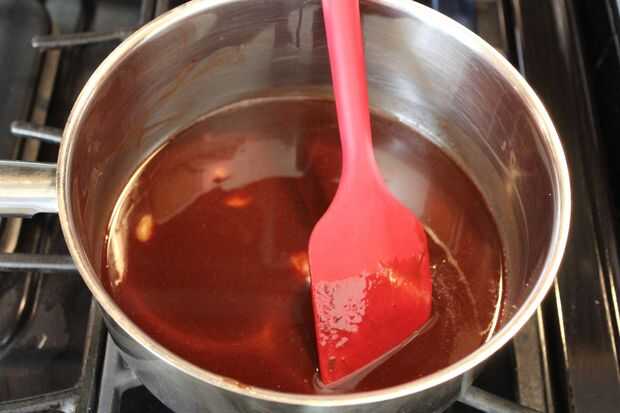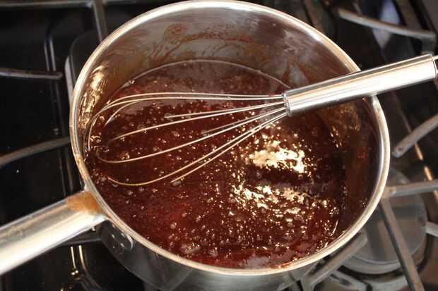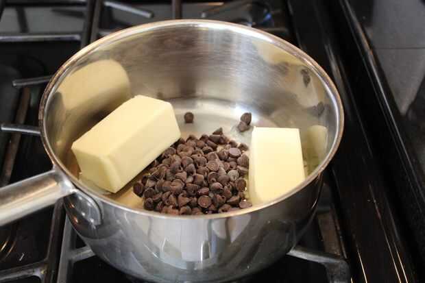 En una olla grande, baja, derretir la mantequilla y el chocolate, revolviendo como funda para evitar que se queme. Retirar del fuego después de la fusión.