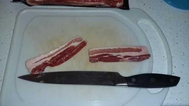 Este paso puede no ser necesario para las rejillas más grandes, pero mis parrillas es bastante pequeño, así que corte mi tocino es la mitad para caber.