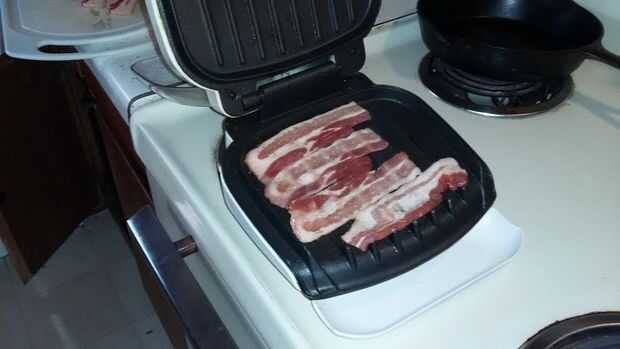Coloque el tocino sobre la parrilla caliente y cerrar. He encontrado en cualquier lugar entre 5 y 10 minutos es bueno. Depende de cómo crujiente le gusta. Los bancos no es necesario pero de todas maneras lo hago... sentir que estoy ayudando.