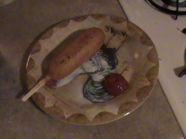 Paso 1: Impresionar a tu cita!Pone la servilleta longitudinalmente en su mano, alternadas puntos de salsa de tomate y mostaza en una línea, rodillo perro de maíz en it... hermosas rayas y haz alternando los gustos con cada bocado!