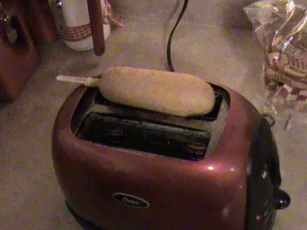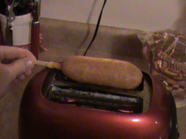 Entonces encontré la tostadora. Una tostadora funciona perfectamente. Ponga el tostador en el ajuste más caliente y empuje el se deslizó hacia abajo para activar. Luego coloque el perro horizontalmente encima del tostador. El perro empezará a hacer la boca de riego se llenarán de sonido. Utilice el palillo del perro de maíz para el perro para que todos los lados estén crujientes. El palo no estará caliente porque está pegando fuera el punto caliente.