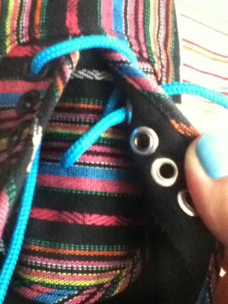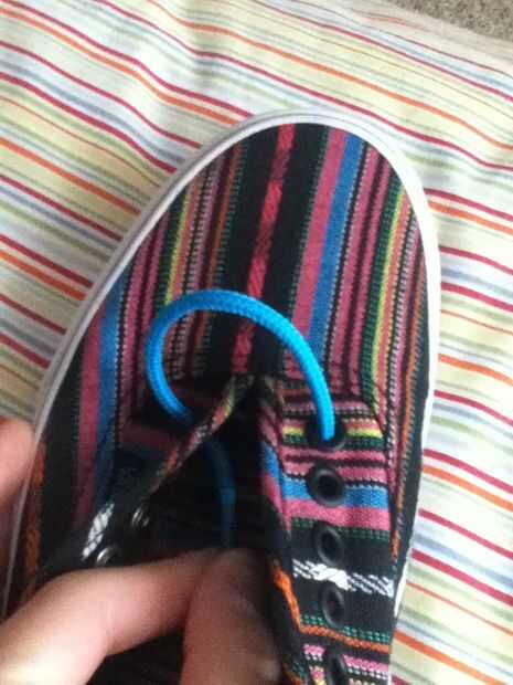 Para uno simplemente tomar su encaje y deslice hacia abajo a través de los ojales más cercano a la punta. Para la segunda barra de tomar el zapato! s del cordón a la derecha y hacia arriba directamente en el ojete delante de la primera de ellas. A continuación, llevar el cordón encima y hacia abajo a través del orificio correspondiente.