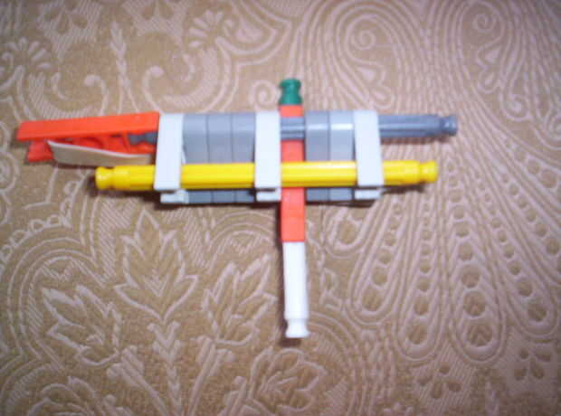 esta es una de las pistolas más pequeñas cada vez. Lo hice cuando llegué realmente aburrido un día. Realmente tiene un percutor y un gatillo! La pistola entera mide aproximadamente 2 pulgadas. Puede disparar pequeños pedazos verdes o blancos. Preferi