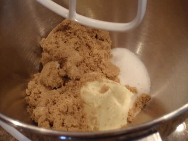 Su mezclador y su azúcar moreno el azúcar granulada y la mantequilla en la batidora. Ponga la batidora en su modo más lento y una vez que la mantequilla ha cubierto sus azúcares, luego poco a poco poner la velocidad de mezcla a medio. seguir mezclando hasta que la masa se ve cremosa. Medio mediante el uso de la espátula traer todo de la masa hacia abajo.