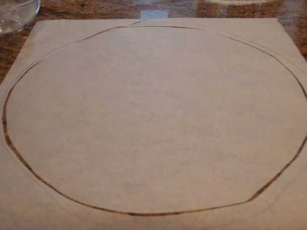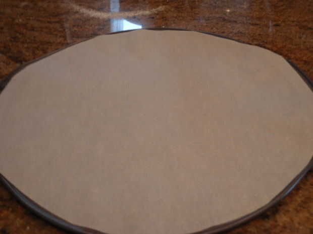 Rastrear su bandeja en papel de pergamino con un lápiz cuidadosamente cortado sobre un centímetro más corto y ponerlo en la sartén.