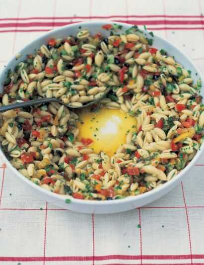 Ponga un recipiente grande de agua salada a hervir. Echar la pasta y los dientes de ajo, hervir hasta que estén al dente, escurra y funcionar bajo agua fría para enfriar. Poner el ajo a un lado para utilizar para la preparación. Poner la pasta en un recipiente. Picar los tomates, aceitunas, cebollina, albahaca y pepino en pedazos de aproximadamente la mitad de la pasta y añadir a la taza. Aplastar los ajos de su piel y puré en un mortero y Maja. Añadir el vinagre, aceite y condimentos. Salsear la ensalada, agregar un poco más de condimento al gusto. Rinde 4 porciones