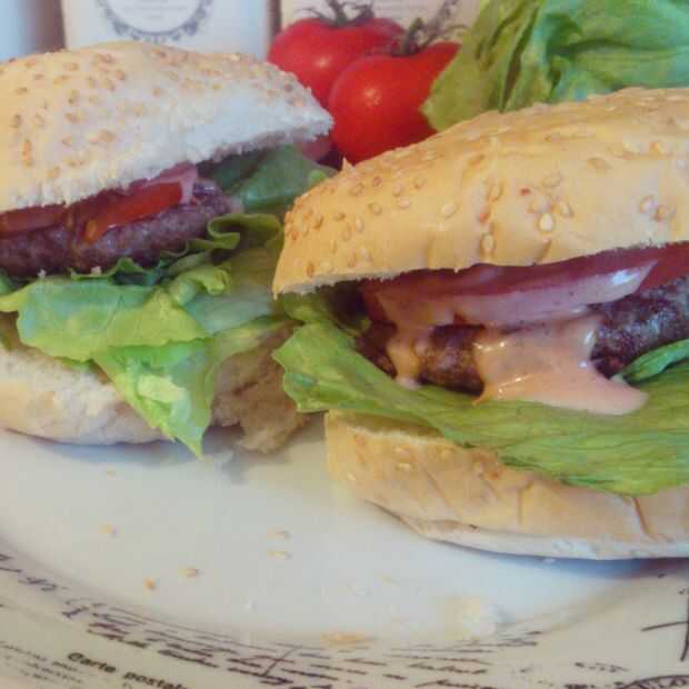 Pila de lechuga, la hamburguesa, una rebanada de tomate y cualquier otros ingredientes que prefiera en su pan y sofoque con salsa; el más mejor!