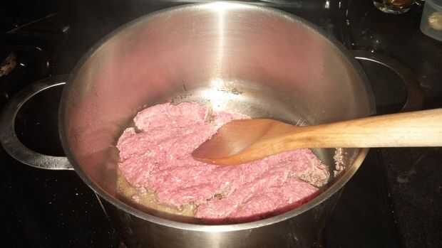 Caliente su olla en Med/Hi hasta que una gota de agua se skitter y vapor cuando se deja caer sobre la superficie. Un buen glug de aceite y añadir la carne. Puré hacia fuera tanto como puede en una empanada gigante y hacerlo rápidamente. Luego, dejarlo solo para cocinar en paz! (como deseo que mis hijos haría) También puede ayudar a activar la ventilación antes las alarmas de fuego que se apaga. Después de unos minutos, debe buscar la carne crujiente y casi quemado. Voltee la patty y cocine el otro lado hasta que se ve la misma.