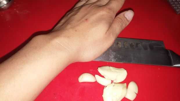 Si tienes un ajo entero, smash con la parte plana de su cuchillo y la cáscara de papel llegará justo al lado.