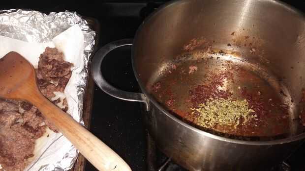 Calentar la olla a fuego medio y añadir un par de cucharadas de aceite, luego las semillas de hinojo. Revuelva una vez y añadir los dientes de ajo machacados. Agregue algunos mas, pero no deje cocinar para más de un minuto, porque estos artículos Arden con facilidad.