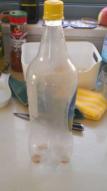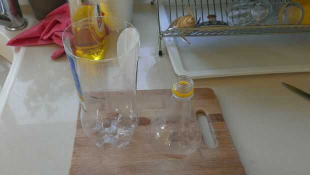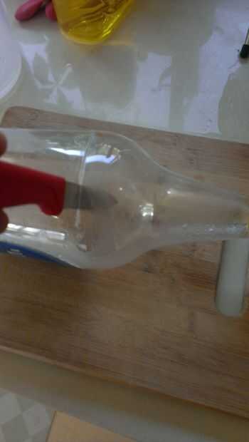 1) tome la botella de plástico y cortar con el cuchillo la parte superior en tercer lugar.