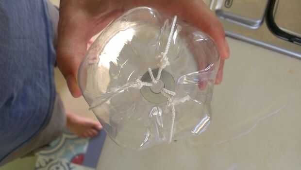 y tire del cable a través de orificios de botellas de plástico de fuera a dentro de la botella.