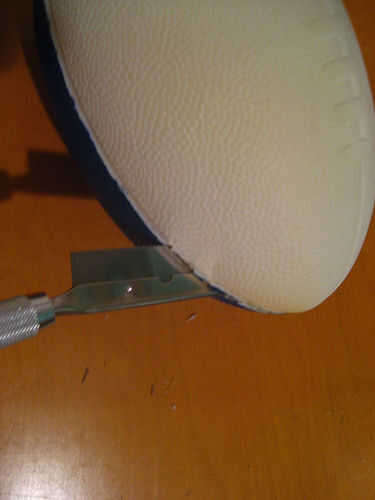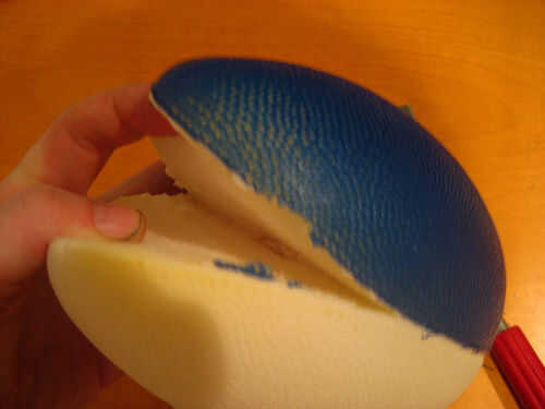 con su cuchillo, cortar longitudinalmente por la costura de la fútbol de espuma, parando sobre hasta la mitad.