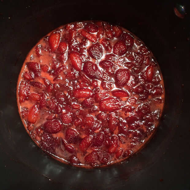 Poner la fruta, el agua y el jugo de limón en una olla pesada no reactivo y llevar a ebullición. Añadir un chorrito de cointreau (o alcohol de su preferencia) ahora si quieres. Añade sabor agradable y el alcohol deben hervir apagado.