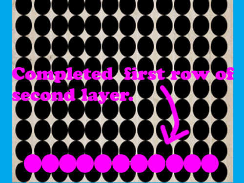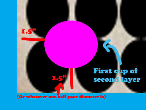 Primera fila de la segunda capa es tan importante como capa 1. Ir a la esquina de la capa 1 y miden 1.5" pulgadas (o lo que uno es la mitad del diámetro de su copa) en ambos lados (que se ilustra en el cuadro 1). Esto es donde debe ir la primera taza. Si mide correctamente el punto central de esta Copa debe ser por encima de la intersección de cuatro tazas.  Terminar esta fila utilizando su borde recto para mantenerlos rectos y en la posición correcta. Punto central de cada copa debe estar por encima de la intersección de cuatro tazas. Una vez realizada la primera fila final esta capa de la misma manera que lo hizo en el paso 4. Recuerde utilizar la primera fila como una guía, para que mantener cada fila en orden.  Esta capa utiliza tazas 121 porque sus tazas de 11 por 11.