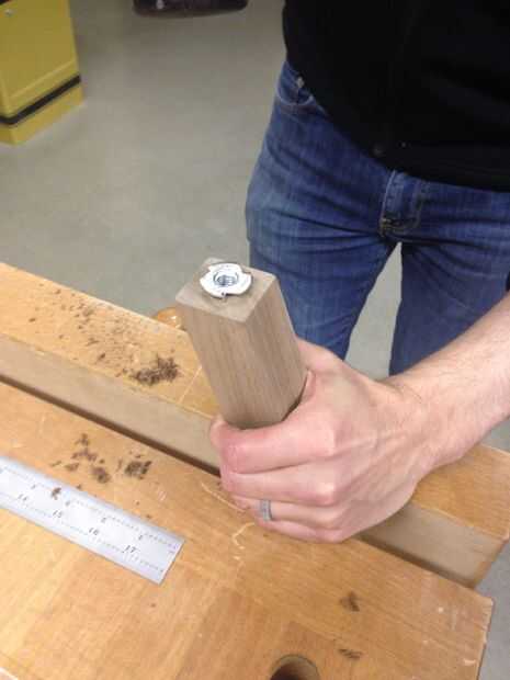 El último paso antes de ensamblar las patas a la mesa fue añadir niveladores hecha de tuercas T y tornillos de cabeza planos.