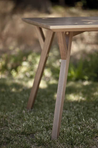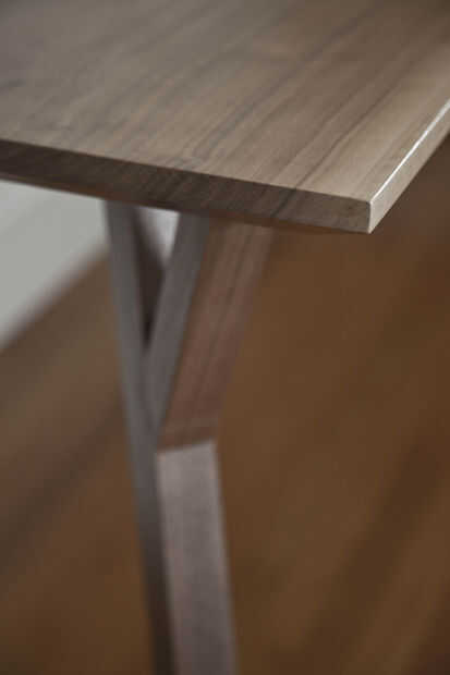 Terminamos la mesa con dos capas de poliuretano a base de agua Aquazar, en clara antiguo piso. Nos dijeron que poliuretano a base de aceite tiende a amarillo de la madera, y queríamos mantener tan cerca de su color natural como sea posible. La compensación es que la poli a base de agua eleva el grano y le da una superficie ligeramente áspera, a pesar de lijado muy diligente.