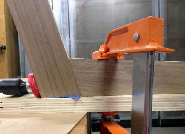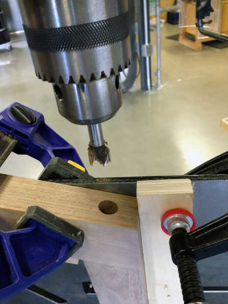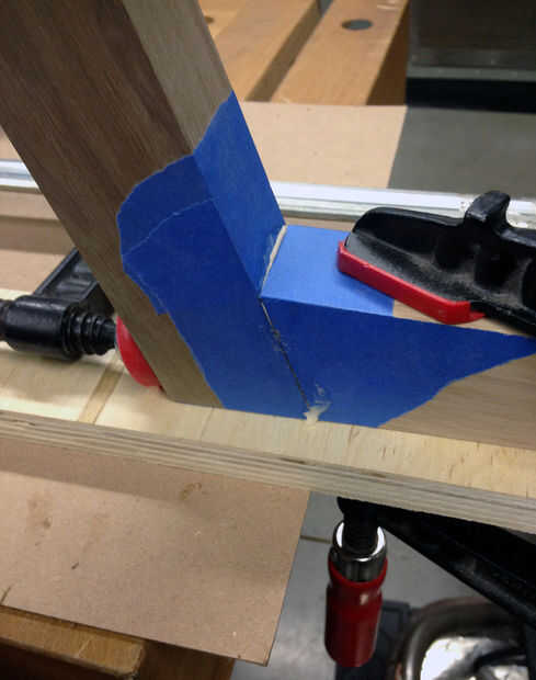 Para garantizar la primera articulación, primero lo pegados juntos, enmascarar la zona que rodea es para facilitar la limpieza. Entonces hemos perforado un agujero ancho para avellanar un tornillo y un profundo, estrecho agujero para el tornillo al entrar. Después de que el tornillo estaba en lugar, el agujero fue conectado con un pasador, que luego fue planeado al ras de la superficie.