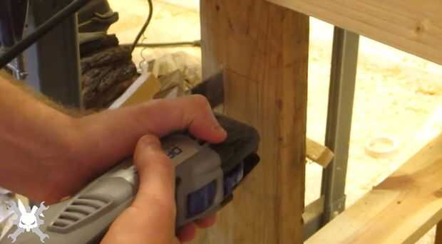 2. es difícil ponerse a apagar el router de abajo, así que monta un interruptor en la pierna a la altura de la rodilla para interrumpir el flujo de electricidad. (Por suerte tuvimos la Dremel Multi-Max y hoja de corte al ras donó a la makerspace).