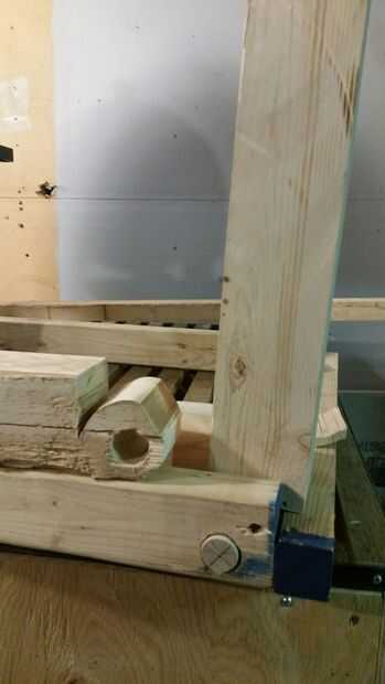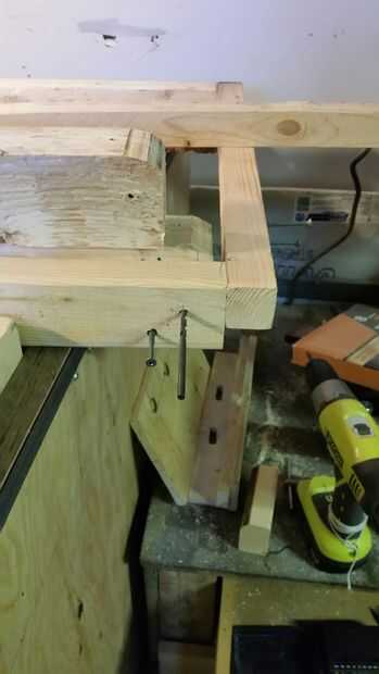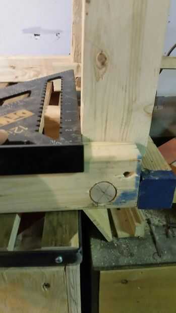 Se pretaladran todos los tornillos y todo lo que importa es contador hundido, solo para que lo dijo. Hice un marco de lados 3 de 2 x 3 y un 2 x 2. Entonces nivelado el marco donde yo quería, ajuste las patas y cortar al ras de la parte superior de la estructura (Foto 1). Entonces establecidas las piernas dentro del marco y atornillar 2 bloques de 2 x 3 al final de la estructura apretada a las piernas (Foto 2). Tengo el marco boca abajo cuando pongo las piernas dentro del marco, estarán al ras con la parte superior del marco. Sujete el conjunto 3 piezas y perfore un agujero piloto a través de pivote con las piernas dobladas, entonces empecé cortando una curva en el extremo de la pierna y mantuvo recorte por lo que le gire abiertas y cerradas. Foto 4 muestra lo que hiere para arriba como. Una vez que las piernas se mueven correctamente, perforé un orificio de 1" a través del orificio piloto para los pasadores de bisagra y un orificio de 5/8" a través de las 3 piezas para el pasador de bloqueo y otro agujero por el lado y la pierna para bloquearlo cerrar los otros 2 x 2 corté en una cuña francesa por lo que pude montar un extremo de la mesa de fresadora a mi proyecto abajo tabla