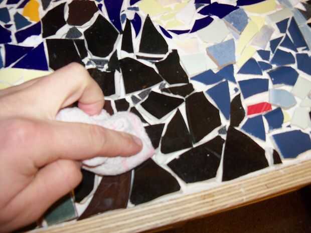 Una vez volteadas hacia atrás, es tiempo para reajustar las fichas y añadir algunas más donde encajan. Según las instrucciones del adhesivo del azulejo, tuvimos unos 45 minutos. Siendo realistas, he trabajado en esto durante unas dos horas sin signos de endurecimiento.