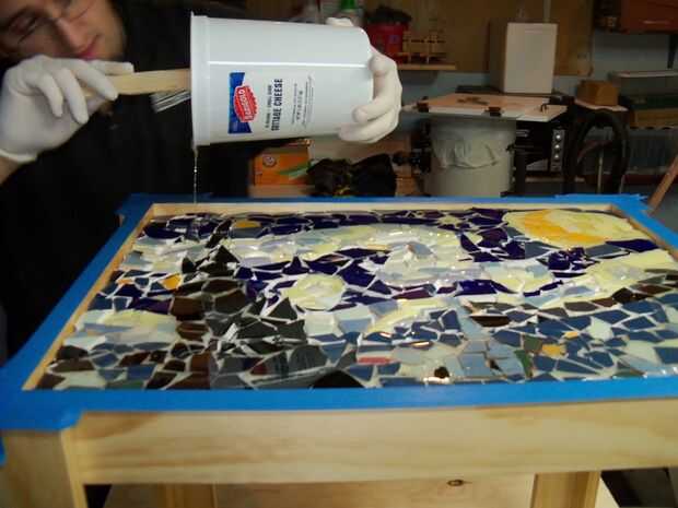 El último paso: verter la resina de epoxy. Nuestro plan original era utilizar la lechada del azulejo, pero cuando nos dimos cuenta que las baldosas no eran la misma altura, y la placas y aun no va a ser plana, necesitábamos una opción diferente. Había recuerdo ver impresionante botella tapa mesa de americangypsy, que utiliza una superficie de vertido de la resina y se dio cuenta de que sería perfecto!