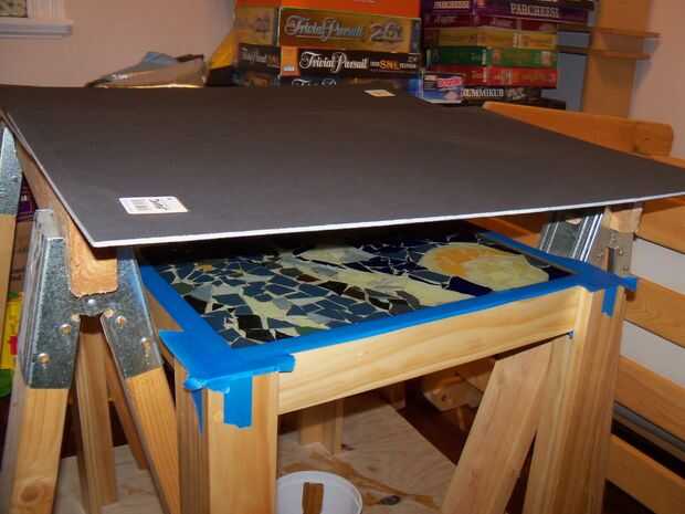 Para preparar, graba los bordes superiores de la tabla en caso de derrames. Usando un nivel, me aseguré de que incluso fue posible por lo que la superficie del líquido no inclinada. Una vez que estaba listo, he mezclado el epoxi y comenzó a verter. Usé el palillo del revolvimiento para moverse el epoxi y entrar en todos los rincones y grietas.
