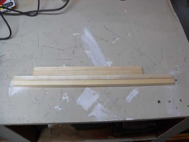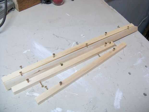 Cada riel es una clavija cuadrada 5/8". Corte a la longitud por lo que habrá un marco completo de todo el camino bajo el tablero superior. Perforar agujeros en cada uno de los tornillos de 1-1/4" de madera, luego poner los tornillos de madera en cada tablero antes de instalarlos. Sabía que sería ser perforación les desde abajo cuando he instalado el tablero superior, y no quería tener que ensuciar con poner los tornillos revés.
