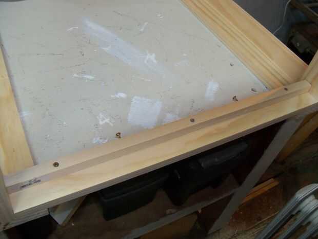 El tablero superior con el mosaico va a descansar en una serie de rieles en la parte interior del marco. Estos necesitan ser lo suficientemente profundo para que el tablero superior y las fichas encajen completamente por debajo del borde del marco. Este fue el primer error que hice, no hice este profundo lo suficiente y terminé todos los carriles de quitar y reinstalarlos inferiores. En ese momento, sobreestimado bajo que necesitaba ir a ponerlos demasiado lejos abajo! El punto es, asegúrese de tomar algunas medidas de antemano y sabe usted cuánto por debajo del borde que es necesario instalar los rieles.