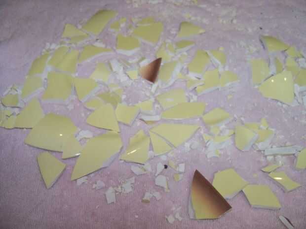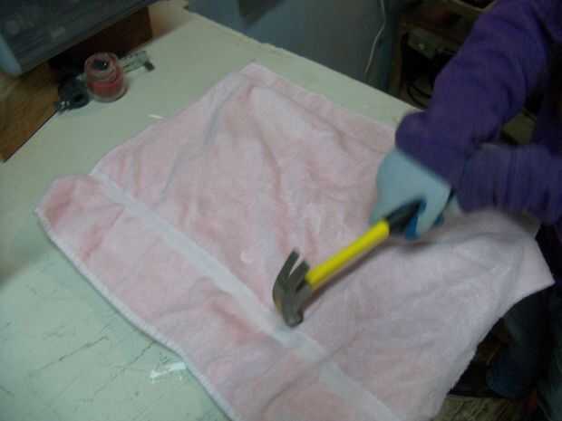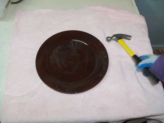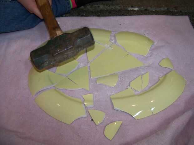 Poner una toalla vieja no importa acerca de abajo en el piso--esto será arruinarlo! Colocar una placa o azulejo en eso, luego doblar el extremo de la toalla. Esto tanto facilitan recoger los pedazos y les impiden volar todos los sentidos. Empezar a martillazos! Intentado un número de martillos, pero colocado en mi pequeño trineo de 2 libras.