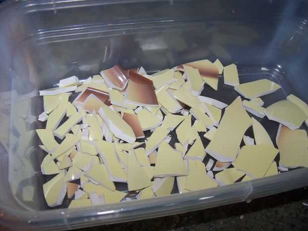 Debe tener unos contenedores a mano para sujetar todas las piezas rotas. He utilizado poco tupperware falso tinas de Dollar Tree.