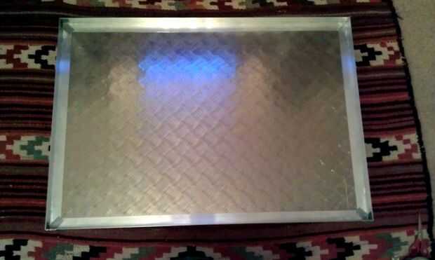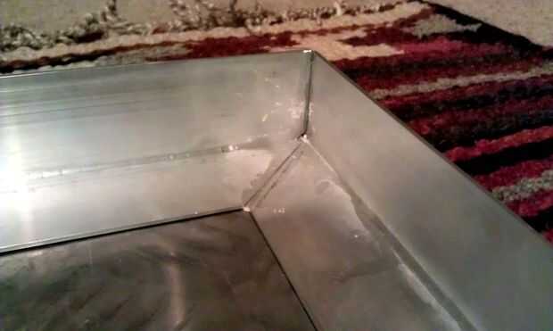 Cortar su extrusión con ángulos de 45 grados de modo que encajan entre sí para hacer un marco (esto no es estrictamente necesario y podría por supuesto simplemente tienes empalmes a tope como las uniones no serán visibles) como la extrusión es en forma de L de la sección transversal, dará un borde a la tabla y así como la superficie de montaje para la hoja de treadplate...